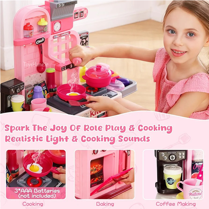 ست آشپزخانه کودک شامل سینک ظرفشویی میباشد که جریان آب به صورت دستی از طریق پمپ کردن خارج میشود.